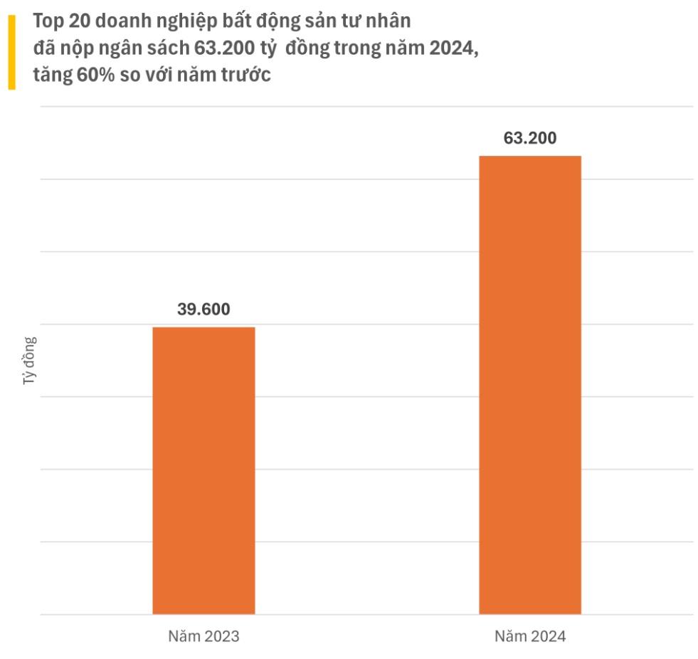 Riêng trong lĩnh vực bất động sản tư nhân, top 20 doanh nghiệp đứng đầu đã nộp tổng cộng hơn 63.200 tỷ đồng vào ngân sách trong năm 2024, tăng gần 60% so với năm trước, tương đương mức tăng tuyệt đối 23.600 tỷ đồng. Trong số này, có tới 13 doanh nghiệp đạt ngưỡng nộp trên 1.000 tỷ đồng.