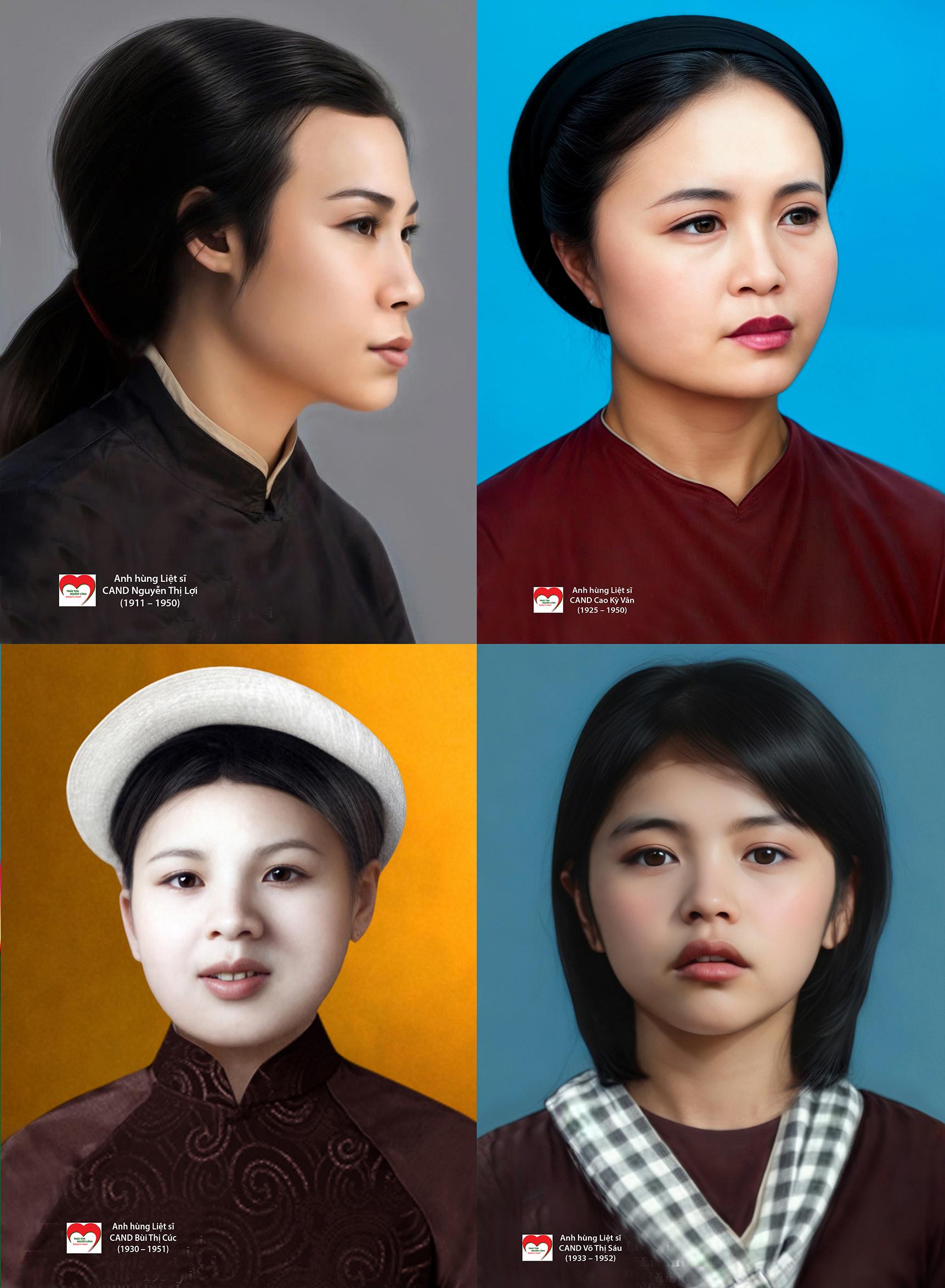 Đó là chân dung của 4 nữ Anh hùng Liệt sĩ lực lượng vũ trang nhân dân: Nguyễn Thị Lợi (1911-1950), tên thật là Trần Thị Lời, được truy tặng danh hiệu Anh hùng năm 1995; Cao Kỳ Vân (1925-1950), tên thật là Nguyễn Thị Được, được truy tặng danh hiệu Anh hùng năm 1998; Bùi Thị Cúc (1930-1951), tên thật là Trần Thị Lan), được truy tặng danh hiệu Anh hùng năm 1995; chị Võ Thị Sáu (1933-1952), tên thật là Nguyễn Thị Sáu, được truy tặng danh hiệu Anh hùng năm 1993.