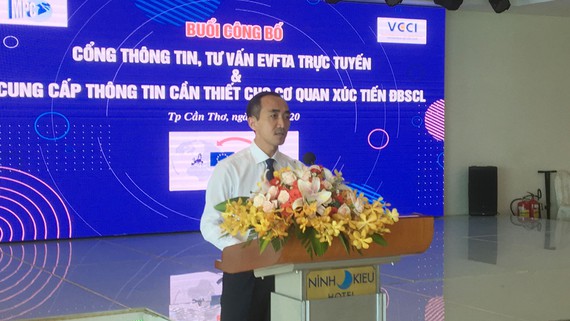 Ông Nguyễn Phương Lâm, giám đốc VCCI Cần Thơ phát biểu tại Buổi công bố Cổng thông tin, tư vấn EVFTA trực tuyến mới đây.