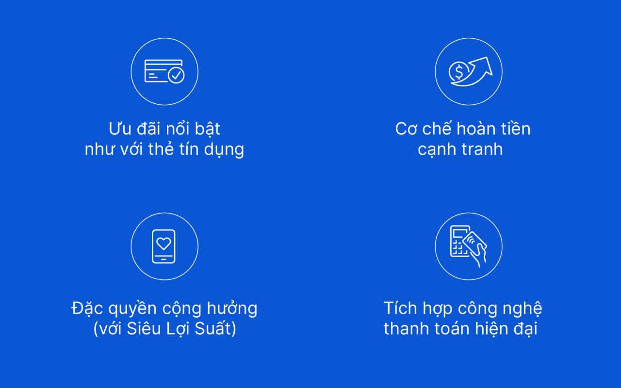 Đặc quyền tương đương thẻ tín dụng: Mức hoàn tiền thuộc top đầu thị trường lên đến 5%, quyền lợi phòng chờ sân bay và các ưu đãi cao cấp khác mà không cần chứng minh thu nhập hay chờ đợi phê duyệt tín dụng.