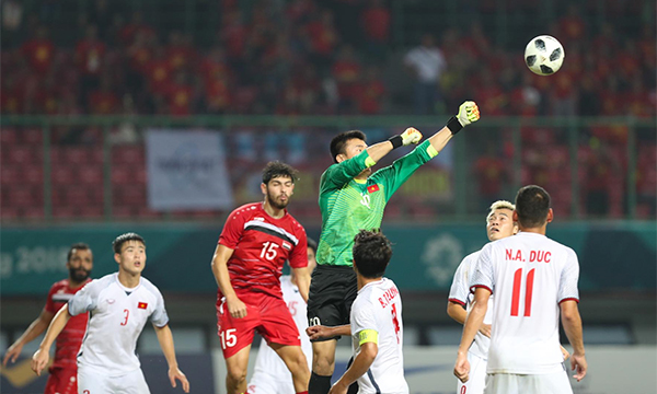 Thủ môn Bùi Tiến Dũng đã có một trận đấu hay khi cản phá nhiều pha bóng nguy hiểm của các cầu thủ Syria.