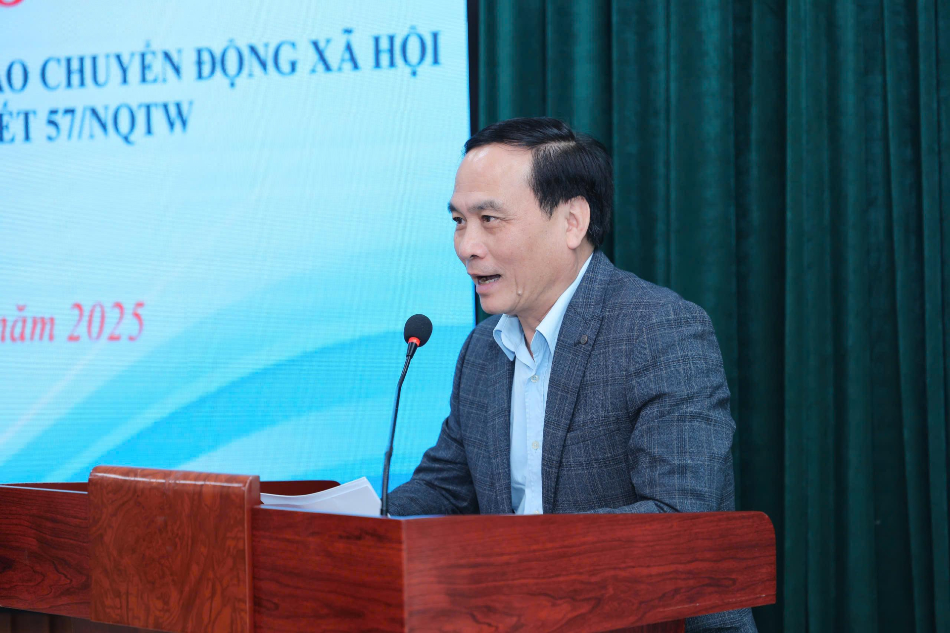 Trong đó, ông nhấn mạnh, các cơ quan truyền thông thuộc Liên hiệp Hội tiếp tục nghiên cứu sâu hơn, kỹ hơn các nội dung của Nghị quyết số 57-NQ/TW của Bộ Chính trị, tìm ra quan điểm mới, những điều cốt lõi có giá trị của Nghị quyết số 57-NQ/TW; tham gia tuyên truyền, thông tin bằng nhiều hình thức truyền thống và hiện đại cho toàn bộ các thành viên/hội viên/tổ chức của Liên hiệp Hội Việt Nam. Công tác này cần được thực hiện thường xuyên, liên tục trong nhiều kỳ/nhiều đợt/nhiều năm mới có kết quả tốt được.