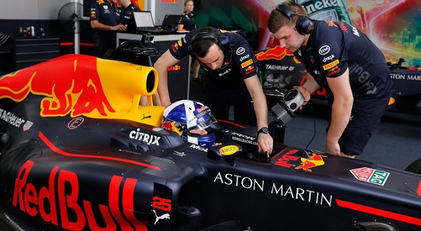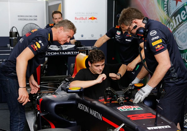 David Coulthard (ngoài cùng bên trái) cùng các nhân viên kỹ thuật chuẩn bị cho chiếc xe trước giờ chạy. Người ngồi trong khoang lái là DJ Martin Garrix, nhân vật tham dự màn trình diễn âm nhạc sau buổi chạy biểu diễn.