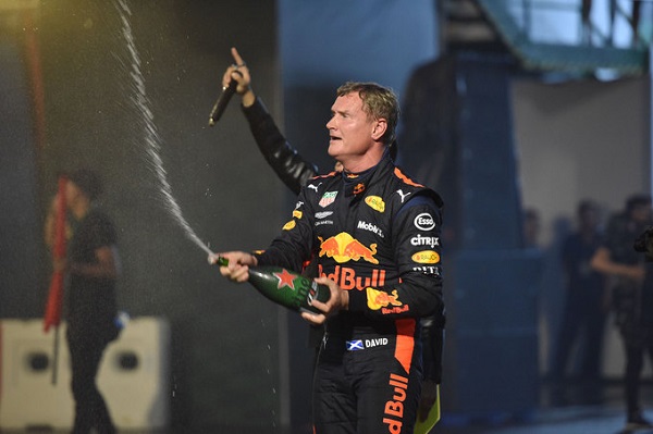 Màn bật champagne quen thuộc của các tay đua F1 khi giành vị trí trên bục podium cũng được Coulthard tái hiện.