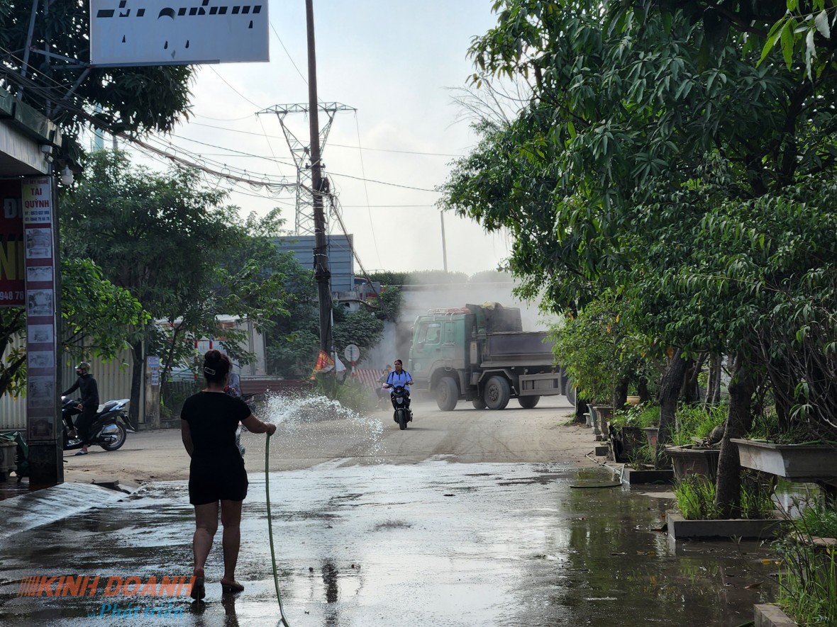 | Người dân hai bên đường ngày nào cũng mang nước ra tưới để tránh bụi vào nhà khiến trên mặt đường hình thành nhiều vũng nước, hư hỏng |