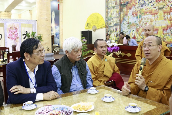 Các đại biểu lắng nghe trụ trì chùa Ba Vàng giới thiệu về lịch sử, ý nghĩa của chùa.